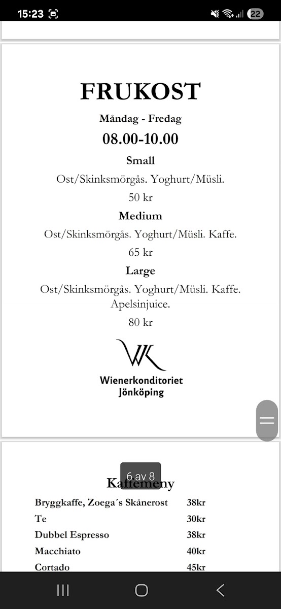 Welcome to Wienerkonditoriet, a delightful cafeteria nestled in the heart of Jönköping at Östra Storgatan 1. Known for its inviting atmosphere and fresh offerings, this charming spot is a haven for pastry lovers and coffee enthusiasts alike. The menu features a tantalizing selection of pastries and sandwiches that truly stand out.
